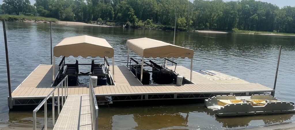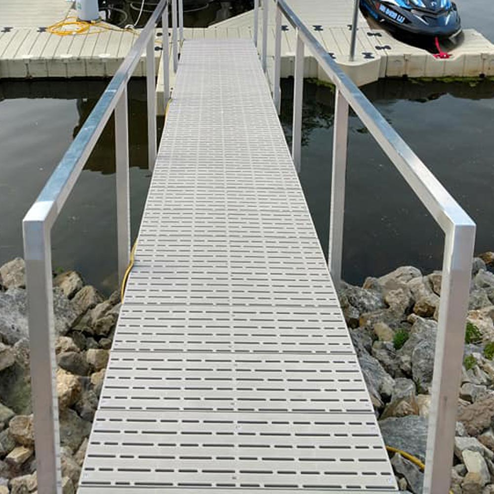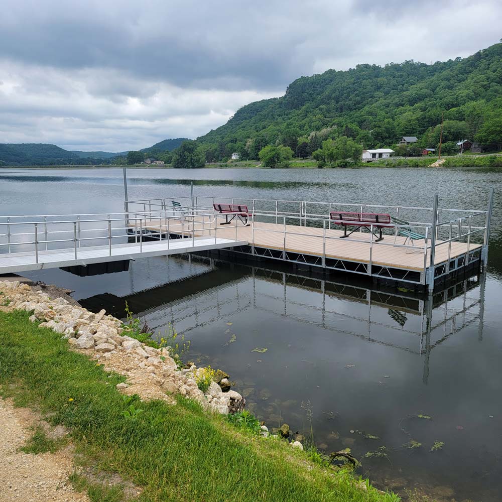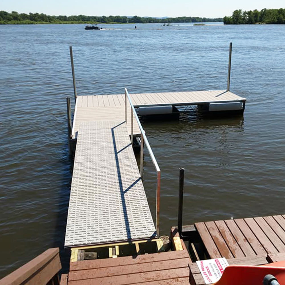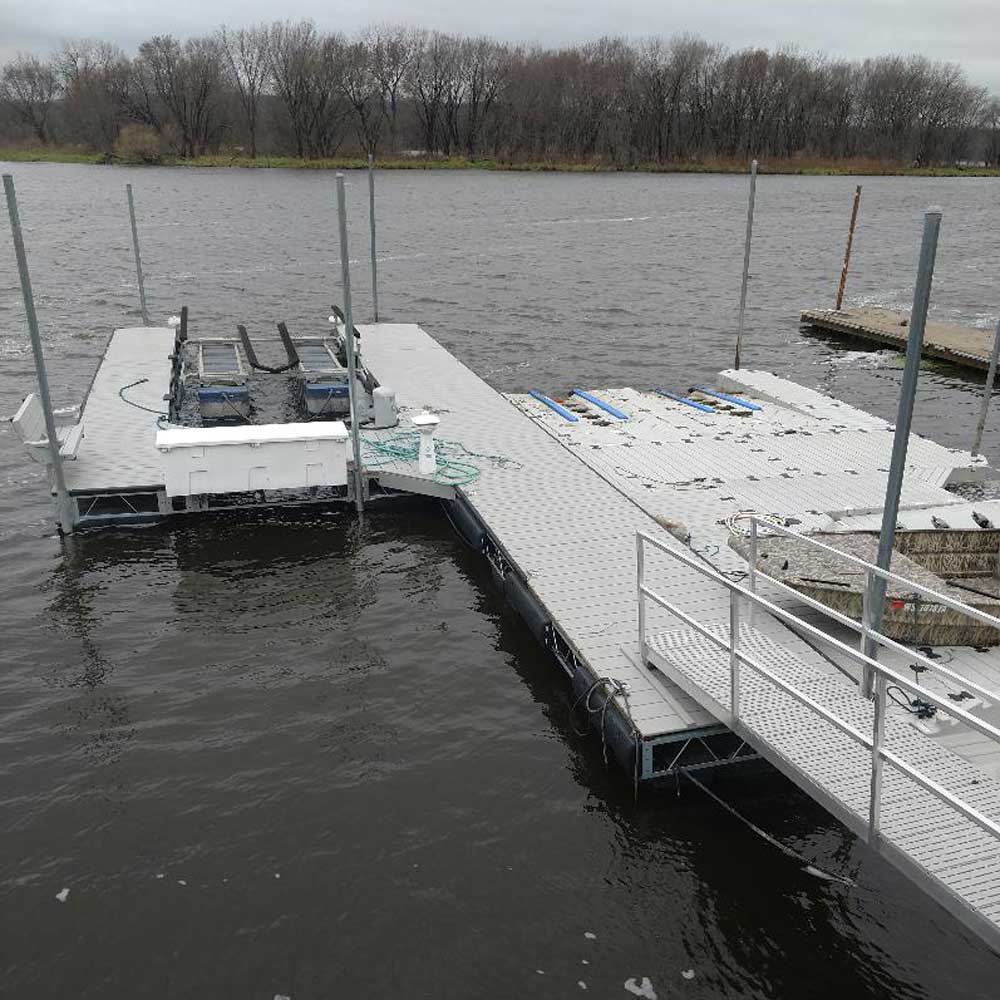 Our custom-built steel frame docks (CRD Docks) are built in-house at our La Crosse, WI location. The CRD Docks utilize a truss-style structure and are built with foam filled black plastic encased floats and decked with Weardeck™ composite lumber by Owens Corning in your choice of a variety of colors. We also custom-build aluminum ramps that are finished with durable Titan decking. Our docks and ramps are suitable for both recreational and commercial use.